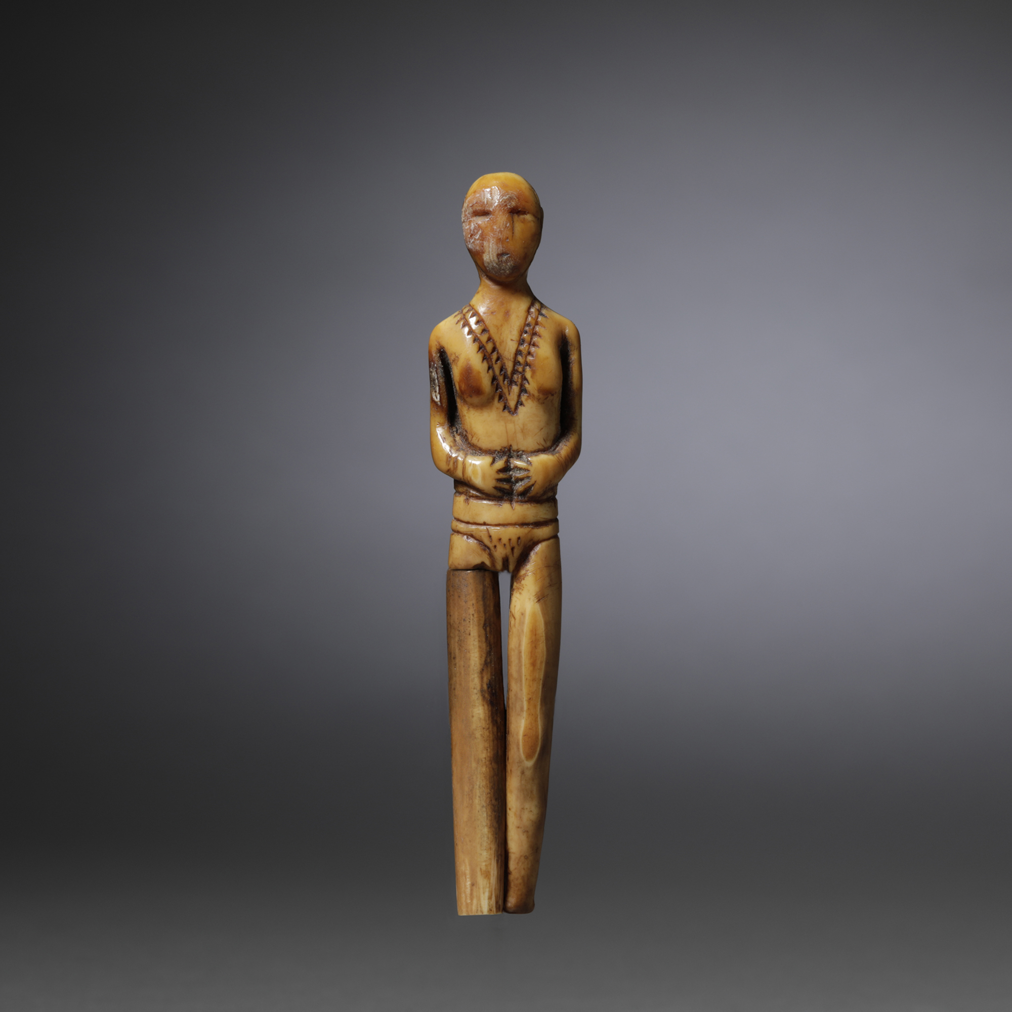 The five works assembled here comprise an exceptionally rare and evocative group of Inuit ivory dolls. Dating from the 17th century or earlier, each of them are lovingly carved with remarkable sensitivity and cultural depth. Fashioned from walrus ivory, a material prized for its durability and luminous surface, these miniature figures embody the history and storytelling traditions of Arctic life.