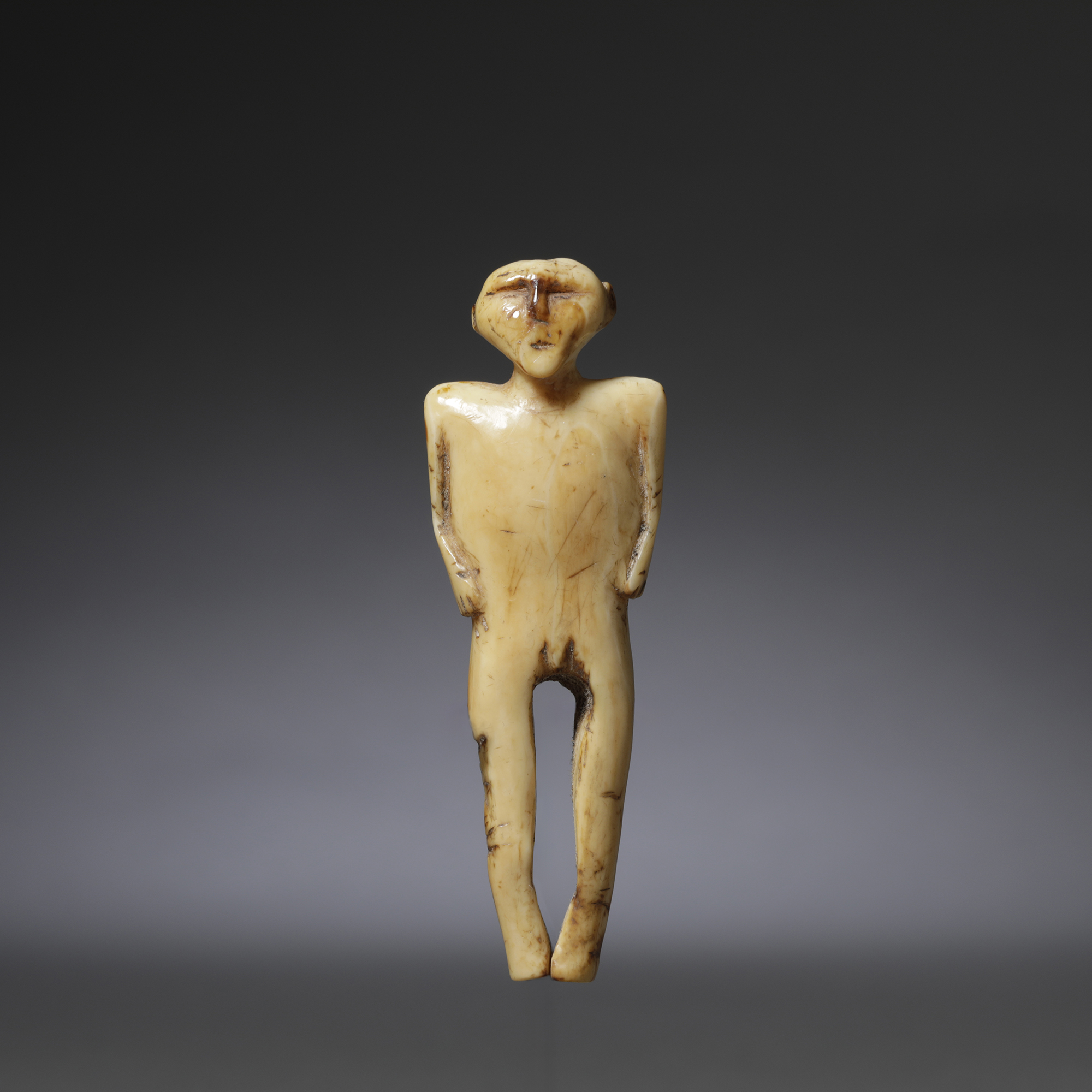 The five works assembled here comprise an exceptionally rare and evocative group of Inuit ivory dolls. Dating from the 17th century or earlier, each of them are lovingly carved with remarkable sensitivity and cultural depth. Fashioned from walrus ivory, a material prized for its durability and luminous surface, these miniature figures embody the history and storytelling traditions of Arctic life.