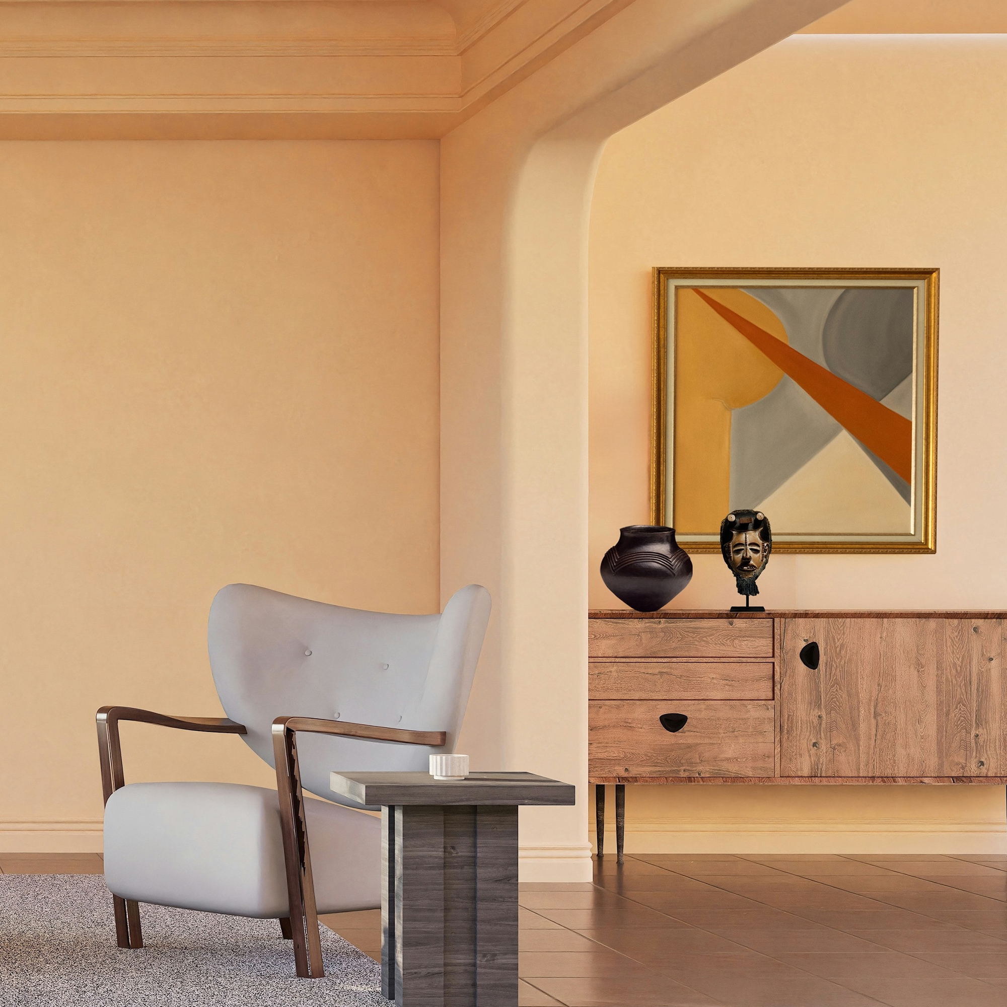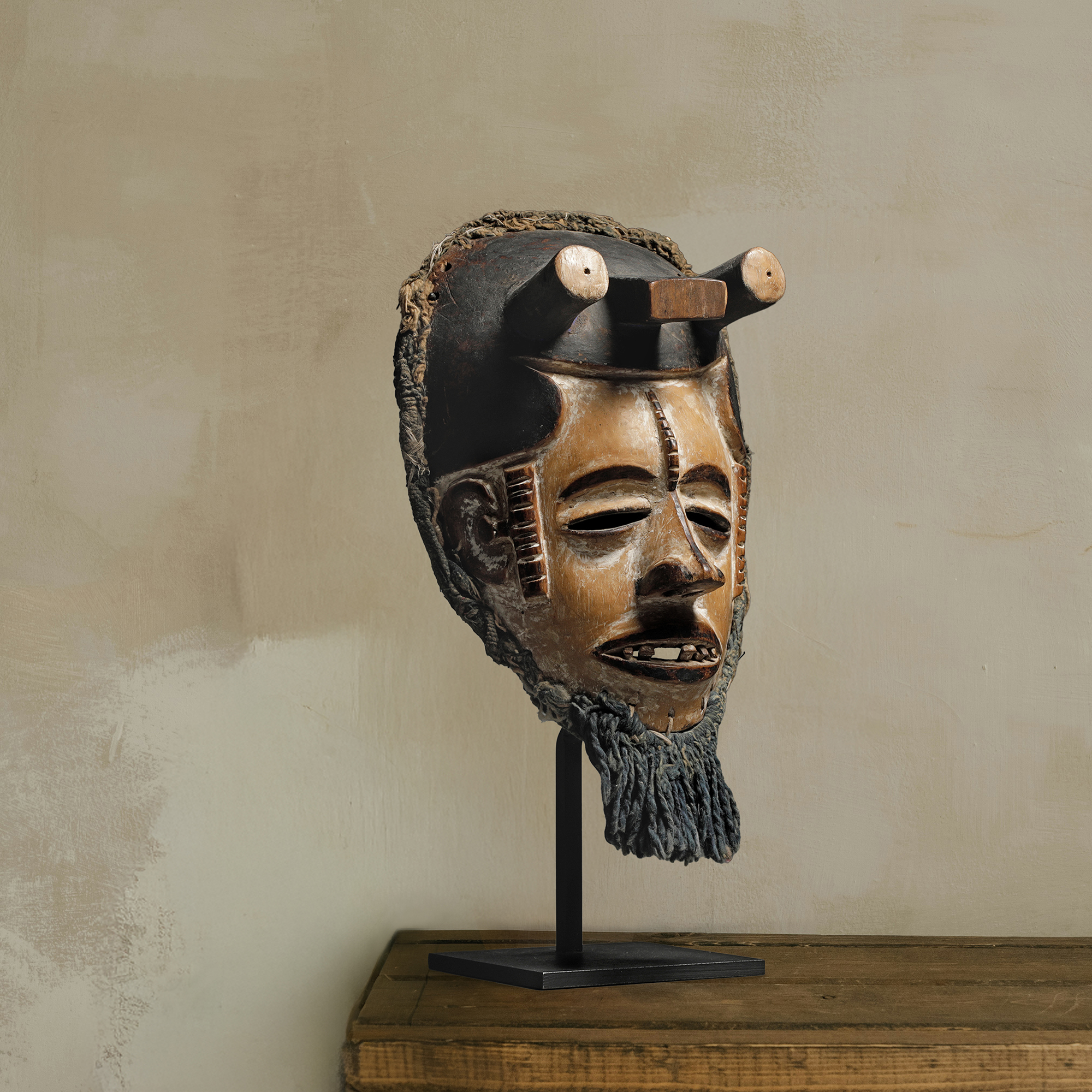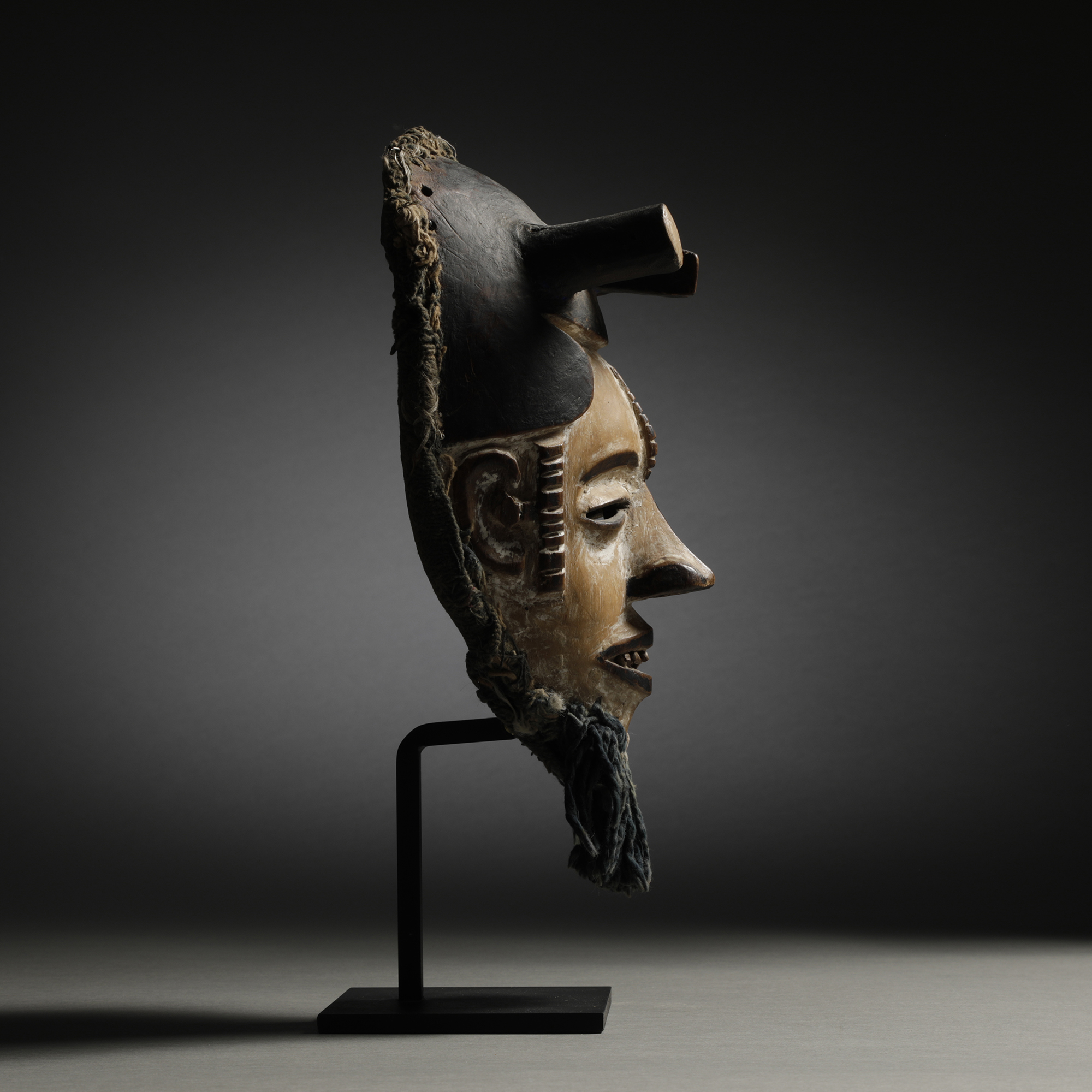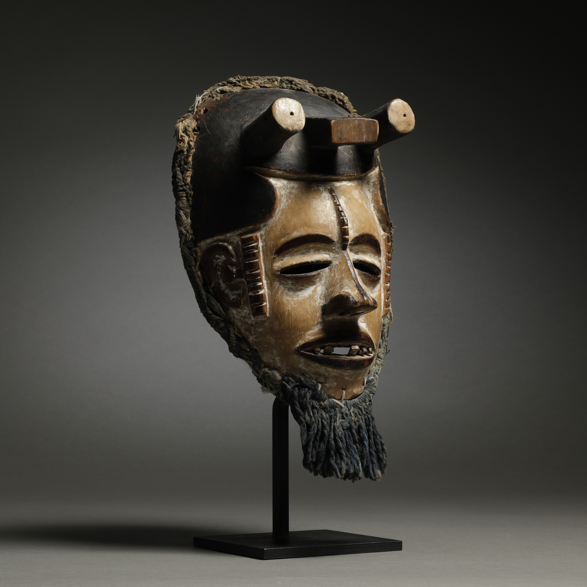 This fine mask is a powerful example of the ichahoho form, carved with detailed care without sacrificing the brusque attitude appropriate to the masquerade. Horns and nose project forcefully outward, creating a dramatic profile. The deep black coiffure amplifies the ghostly aspect of the face, with its kaolin pallor and bared teeth. A dense fringe of fiber with a textured beard frames the perimeter of the mask. This piece is attributed to Ochai of Otobi, a master carver who was active between 1910 and 1950. Unlike most other artists, Ochai was a full-time sculptor and had commissions from a wide range of villages beyond the borders of Otobi in south-central Nigeria.