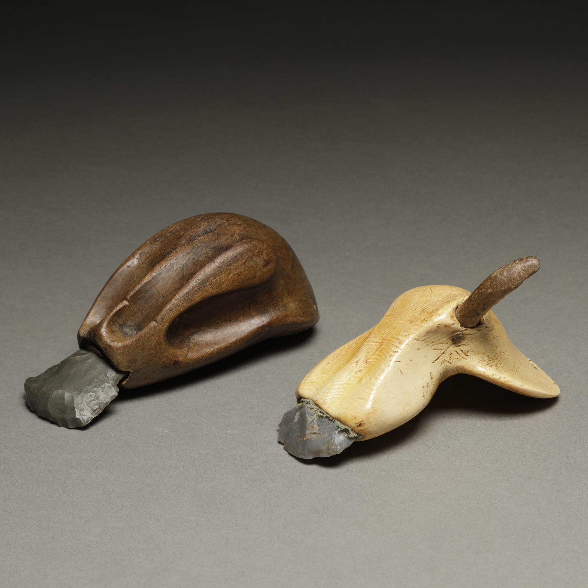 These fine Eskimo hide scrapers, dating to the nineteenth century or earlier, are a small showcase of the genius of Arctic craftsmanship. Both tools feature jade blades, a stone valued for its aesthetic beauty as well as its strength and resilience – qualities essential for processing animal hides in harsh Arctic conditions.