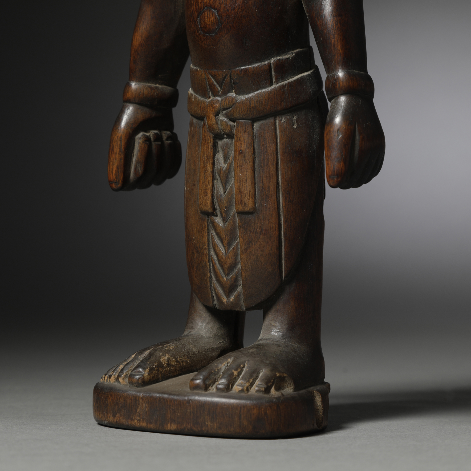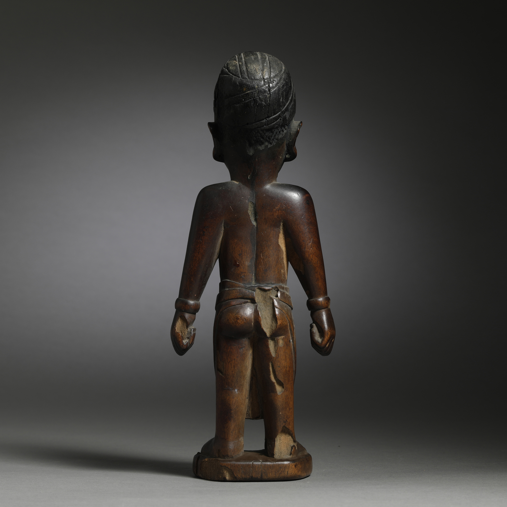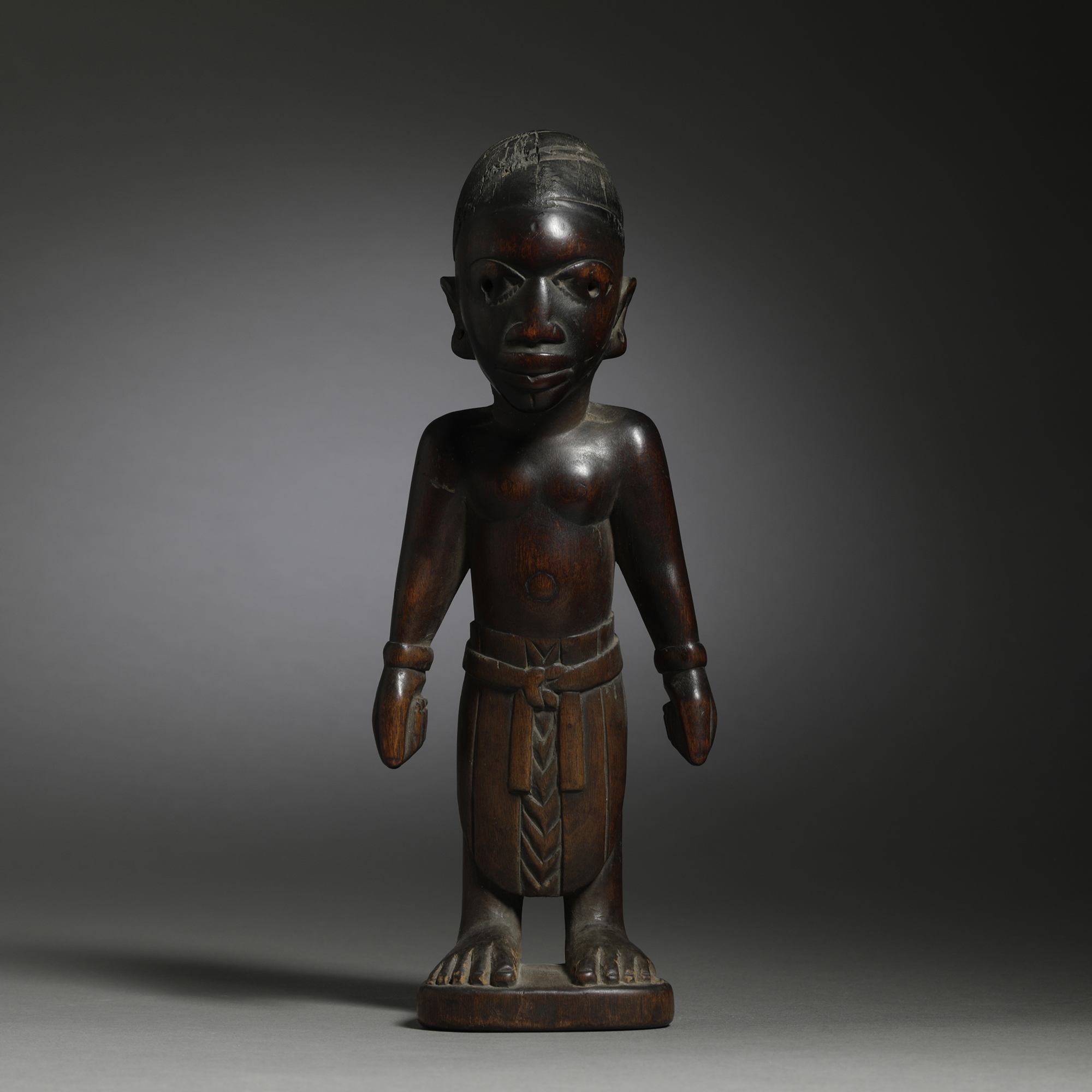 Refined sculptor’s skills are shown in this masterfully-carved ibeji figure, which is confidently shaped with strong proportions and crisp details. The strength of youth shines from the upright posture, sure stance, wide shoulders, and soft features that seem to hint at muscle beneath. Finer detail work is found in the relief-carved garments and the exaggerated, almost elfin features of the face, with its almost supernaturally large eyes and delicately turned ears. The coiffure in this statuette is minimal, cut in an assortment of relatively casual lines incised around the crown of the head. A beautiful patina of deep mahogany and deep, dark brown with glows of warm rust red suggests a long history of cherished use.