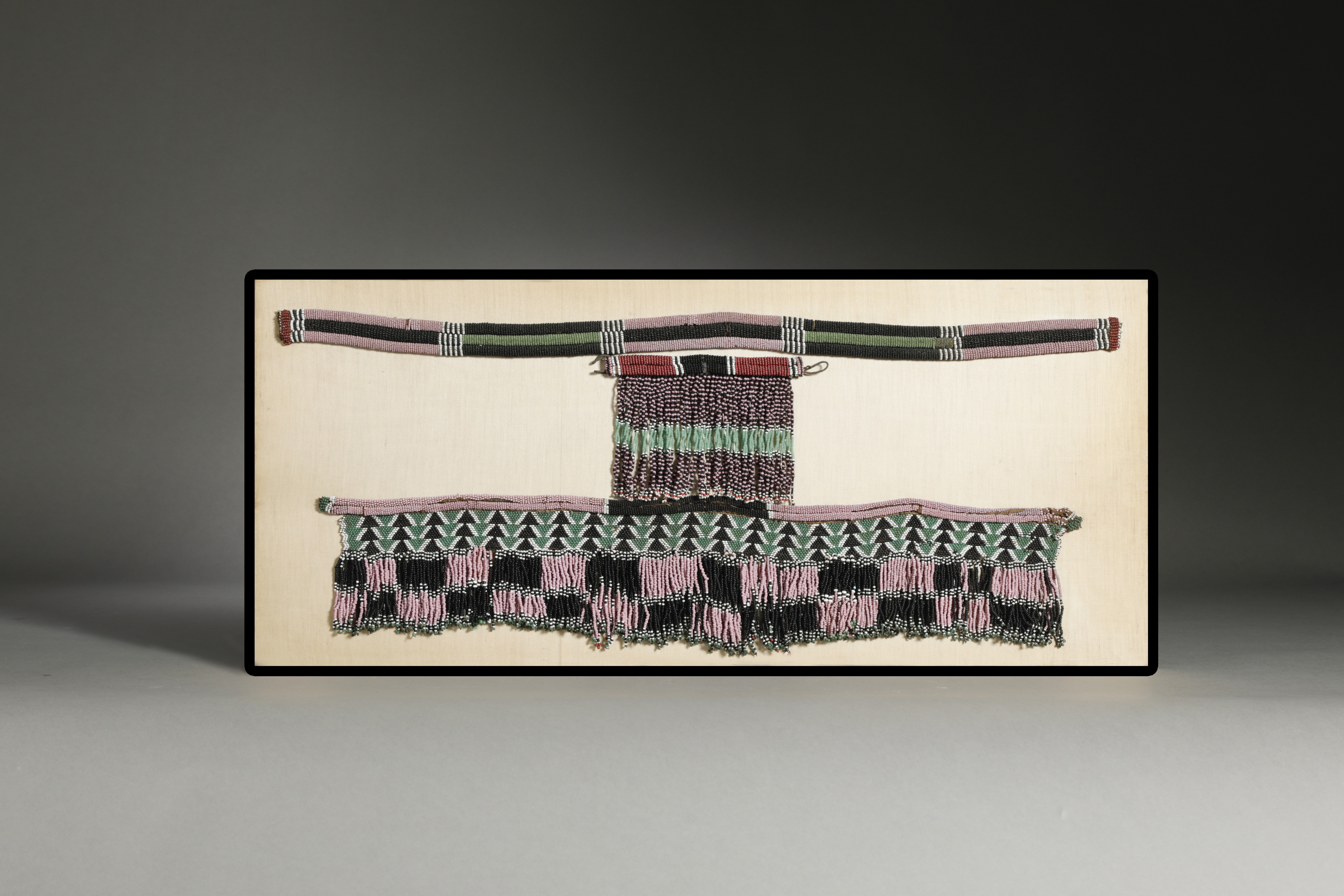 The Zulu and their neighbors often wore beadwork in ensembles, with overlapping pieces that sometimes hung in several layers. The fine set of women’s garb presented here illustrates the vivid display of such combinations. Beaded in a beautiful palette of pink, black, and green with white delineations, the alternating patterns used provide an exciting theme of contrast and an impression of vigorous energy. The set is mounted on an original late 19th/early 20th century frame. Inscribed in ink on the back of the frame is a description reading “Zulu Ladies Dress, Zululand 1891, G.W. Maunsell.” An old typed label is also present, inscribed “Mrs. Gell, O.B.E., Hopton Hall, Wirksworth, Derbyshire.”